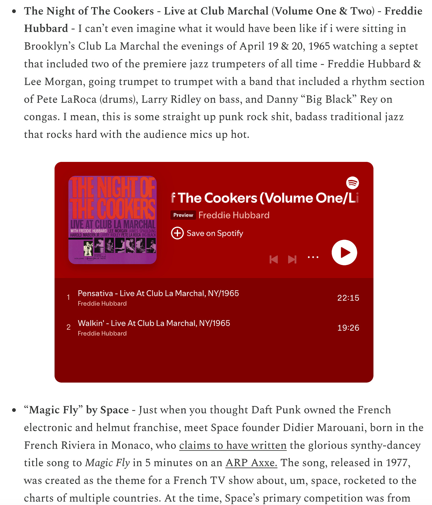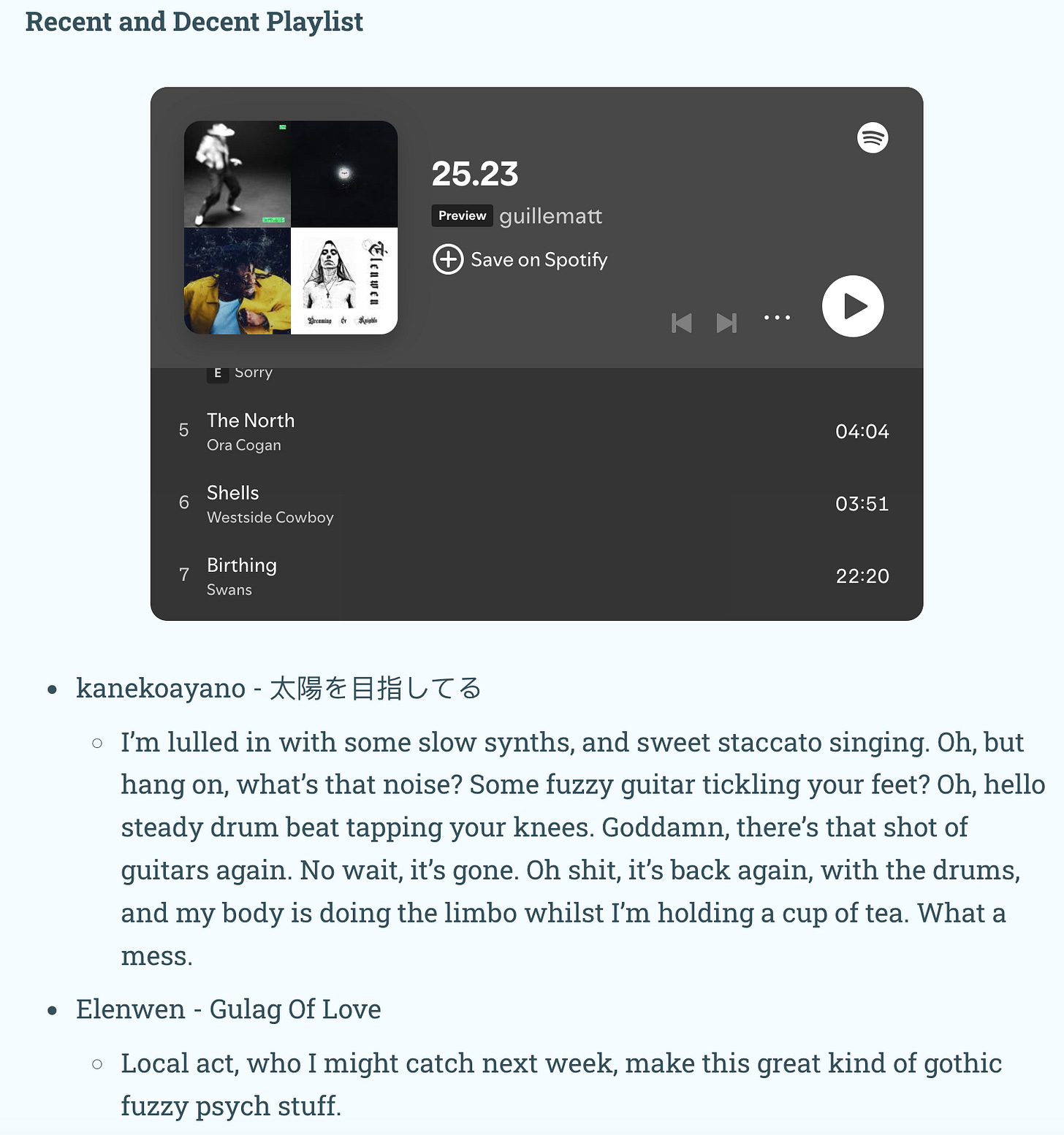 In his Substack, you’ll find brief recommendations and playlists for recent music he’s enjoyed, monthly gig recaps, and community playlists where he encourages his followers to submit songs based on a theme he presents.