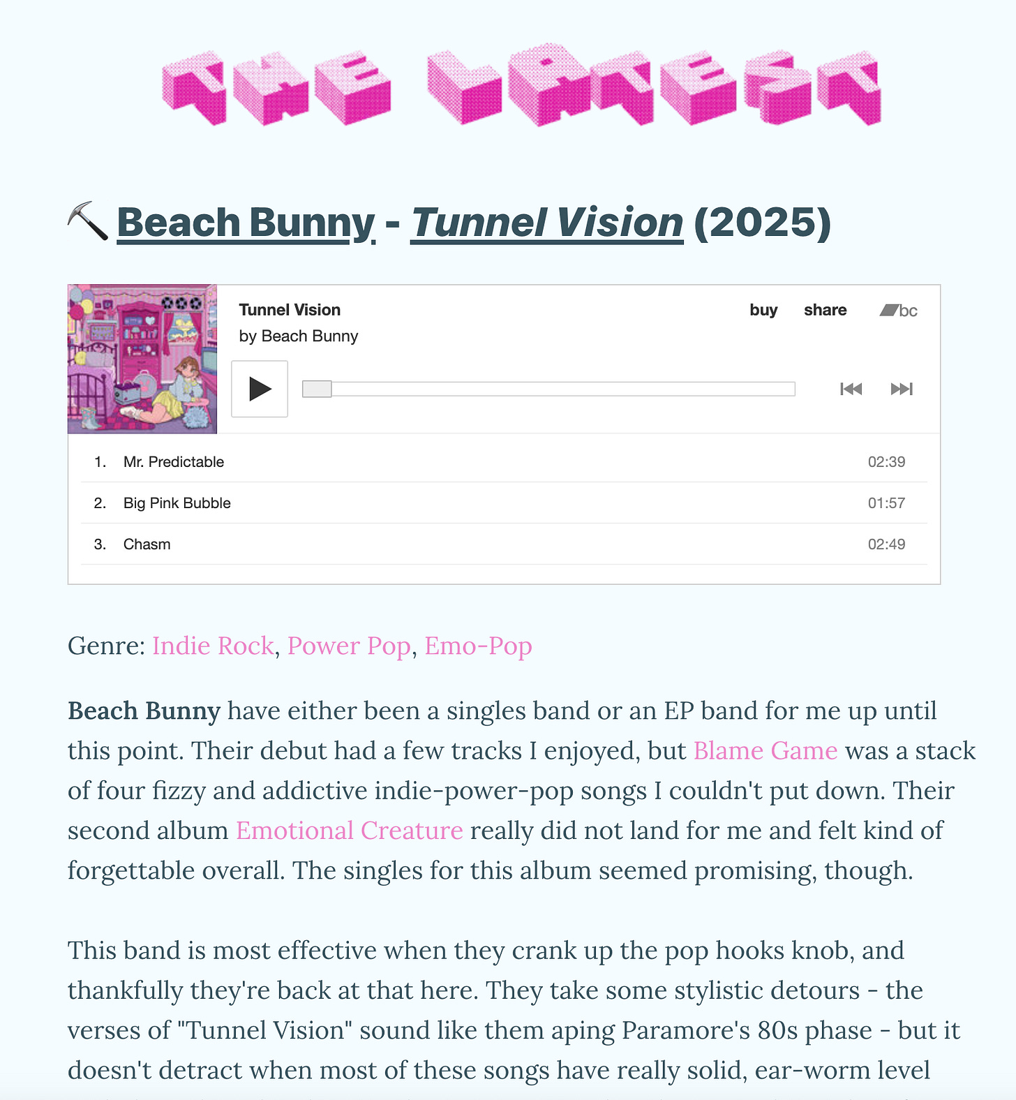 delivers very comprehensive reviews and recommendations for music, formatted in a way that reminds me of a lot of my favorite music blogs in the late 00s.I love to share music - I listen to a lot of it, so I figured why not build a place to put my thoughts?