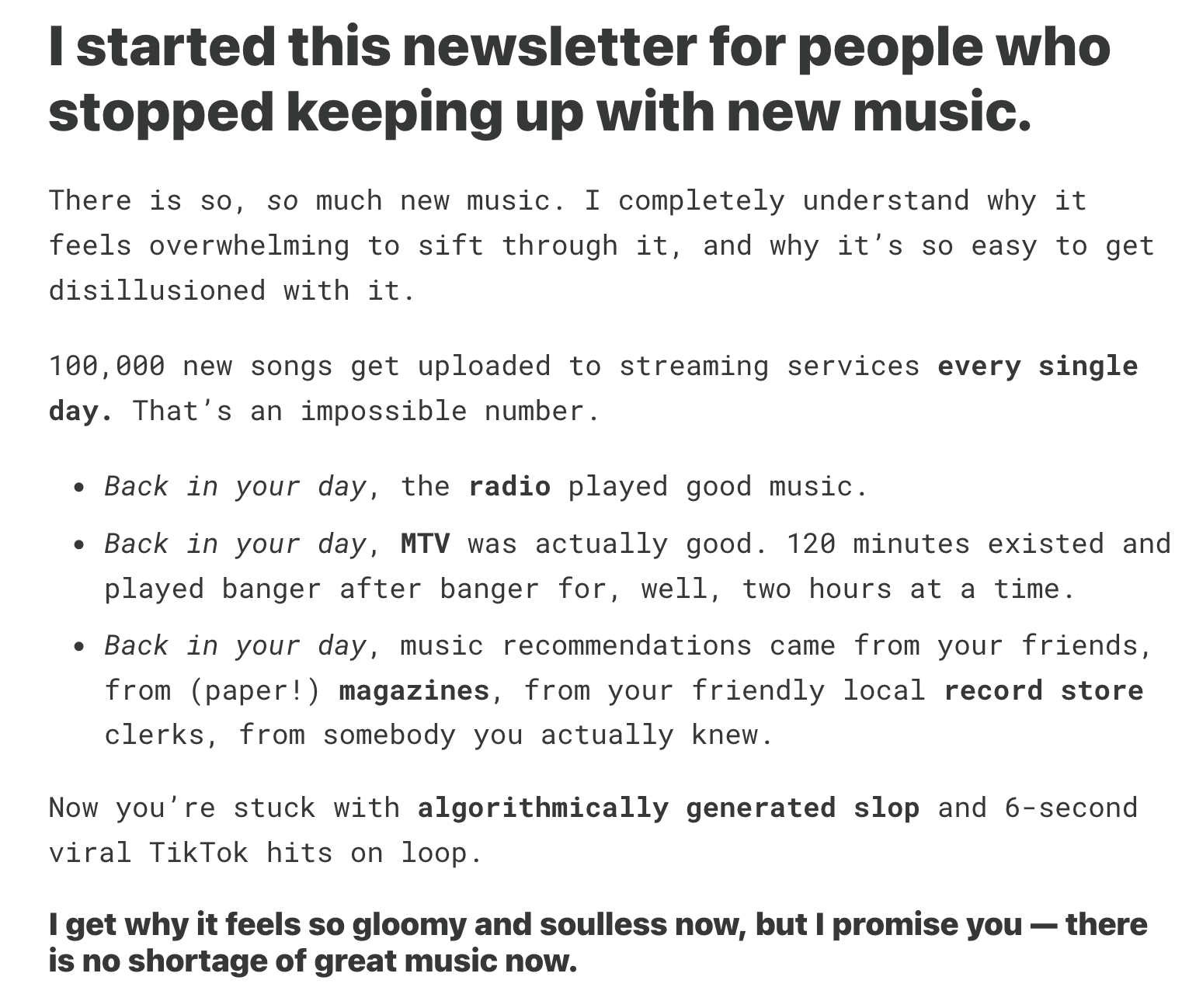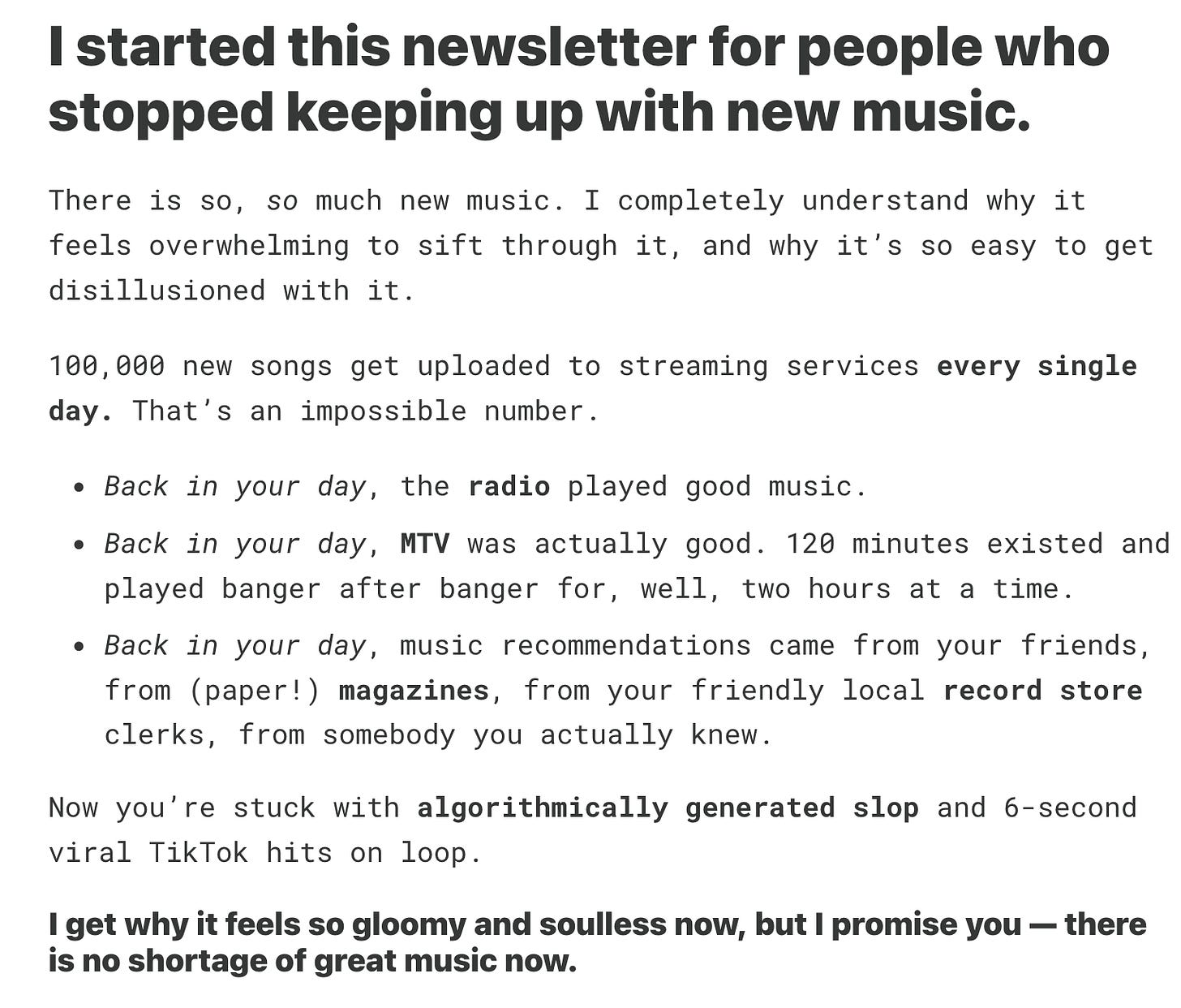 This is a place for people who want to get into new music but feel overwhelmed by it, or maybe even think it hasn't been good since [insert whatever decade it was that you were in your 20s]. Basically, I’m trying to get you excited about music discovery again.